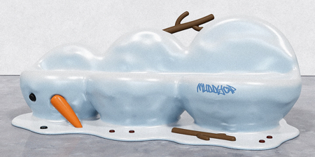 Creative bench shaped to look like a melted snowman, slumped into a glossy puddle, carrot nose still intact, and coal eye staring into the void…