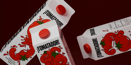 Eye-catching juice packaging with fighting tomatoes communicates natural energy, strength, as well as everyday refreshment.