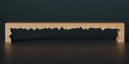 Wooden bench with smooth top layer is split along the inside by a jagged rift that creates a unique contrast between refined furniture and raw wood.