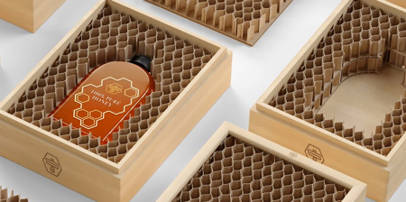 Wooden box paired with sculpted paper honeycomb cradles the bottle to create the impression that the honey comes straight from the beehive.