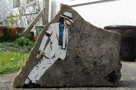 Jamie Paul Scanlon paints art on rocks, pavement, and walls of buildings.