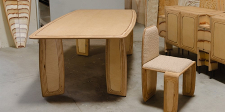 Drawing inspiration from classic surfboards, wooden furniture includes chair, table, and storage that balance architectural design with organic forms.