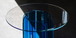 Creative furniture with layered design extends from the sides and looks like it is caught in the middle of a visual ripple or time-lapse sequence.